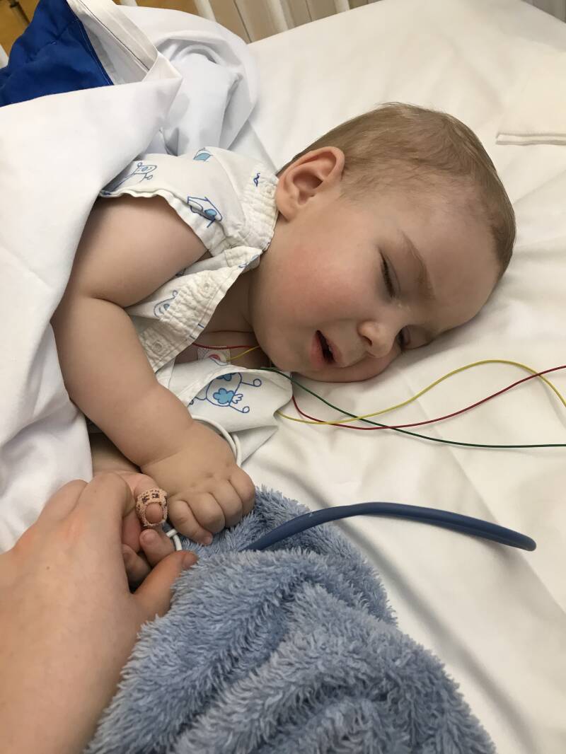 Ik legde Jona neer en de anesthesist zette het kapje op zijn neus. Hij schrok en begon te niezen. Niet één keer, maar vijf/zes keer achter elkaar. Het duurde even, maar toen zakte hij weg. Zijn ogen bleven half open staan, een naar gezicht en ik vroeg de kinderanesthesist of hij nou wel echt sliep. Hij verzekerde me dat Jona sliep.